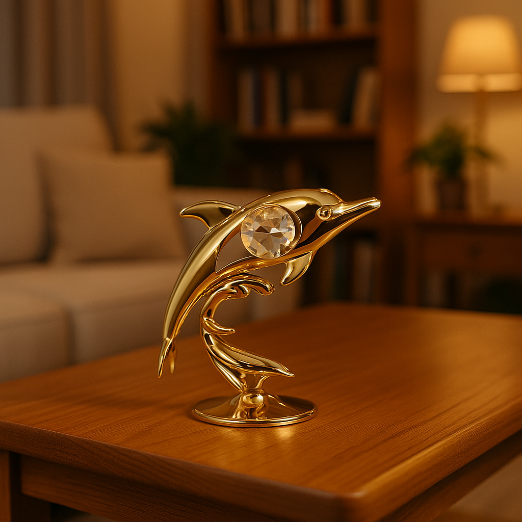Laat je betoveren door dit elegante dolfijnbeeldje, verguld met 24-karaats goud en versierd met een fonkelend Bohemia-kristal. De sierlijke vorm en het speelse karakter van de dolfijn brengen een gevoel van vrijheid en vreugde in huis.
