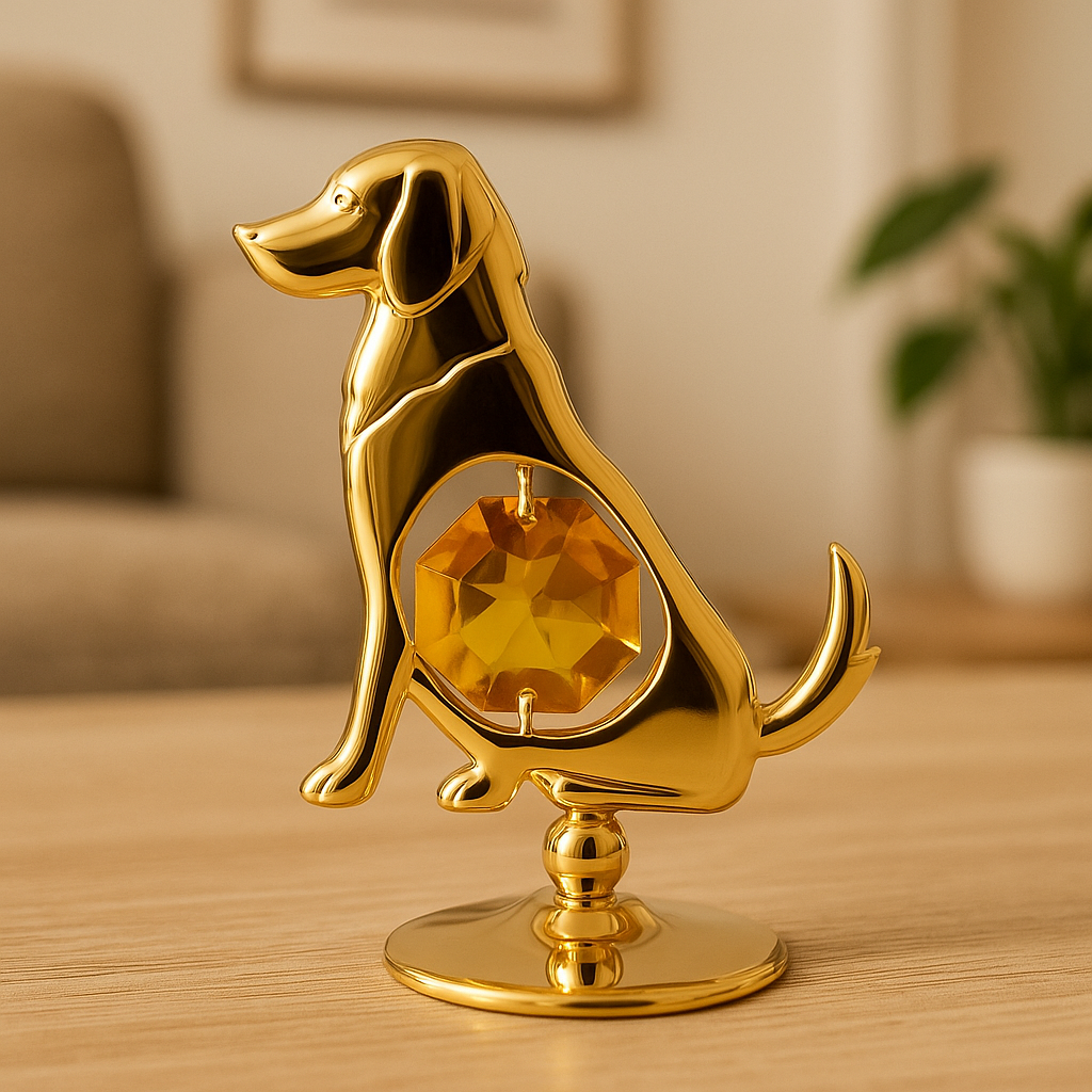 Een trouw en sierlijk hondenbeeldje, verguld met 24-karaats goud en voorzien van een schitterend Bohemia-kristal in warme ambertint. Dit decoratieve stuk straalt elegantie en huiselijke charme uit, perfect voor op tafel, kast of bureau.