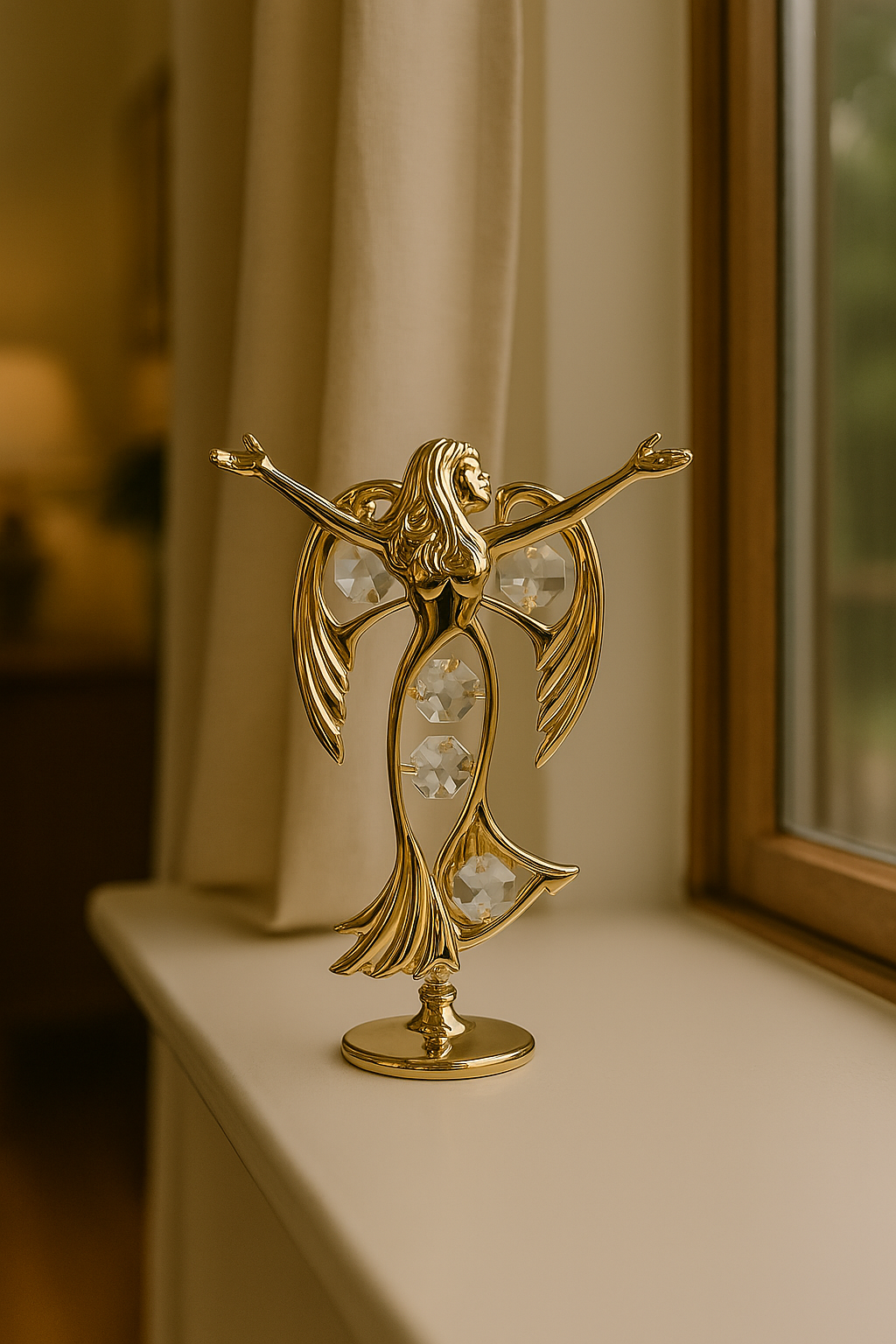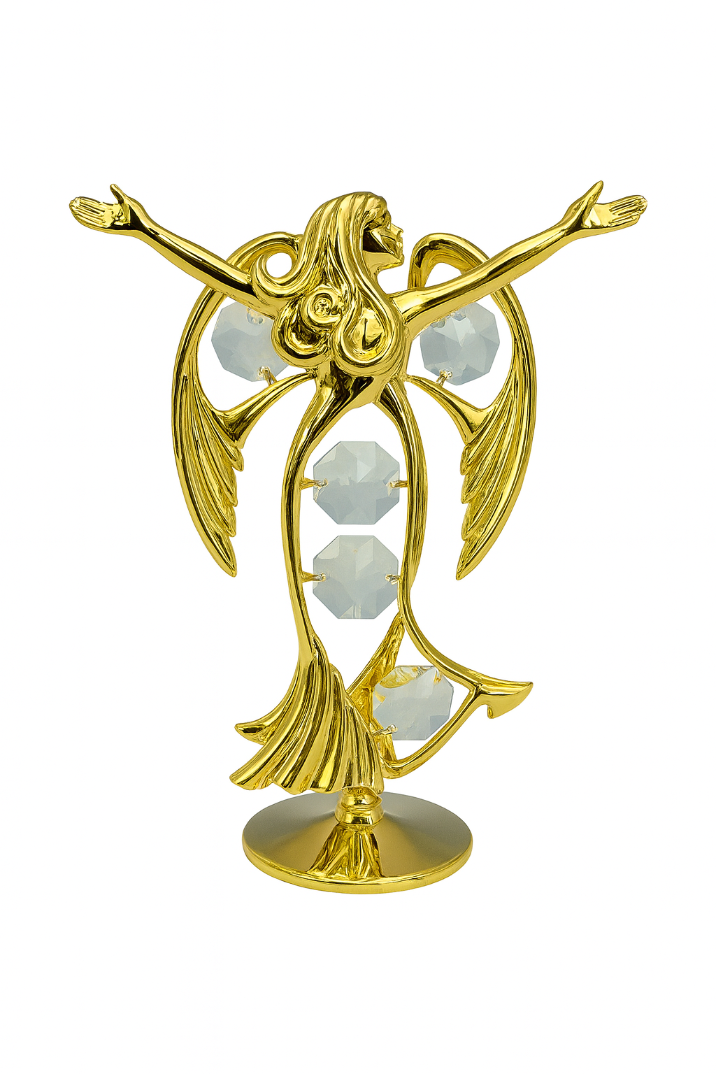 š« Een elegant en sierlijk engelbeeldje, uitgevoerd in 24-karaats verguld goud en rijkelijk versierd met heldere Bohemia-kristallen. De engel staat met uitgestrekte armen als symbool van bescherming, licht en vrede. Een verfijnd decoratief object dat rust en schoonheid uitstraalt in elke ruimte.