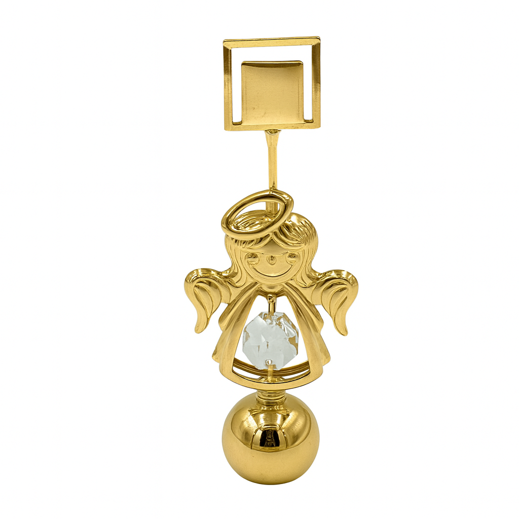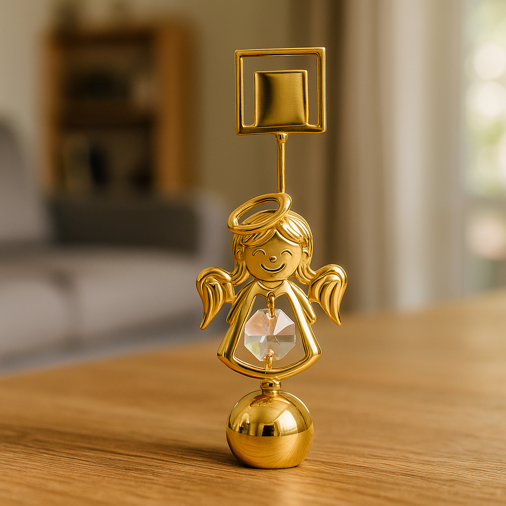 Een lieflijk engeltje met gouden vleugels, vrolijke glimlach en een zuiver Bohemia-kristal in haar jurk. Deze 24-karaats vergulde engel staat op een elegante bol en houdt boven haar hoofd een fotohouder of kaartclip vast β perfect voor een lieve boodschap, foto of naamkaartje.