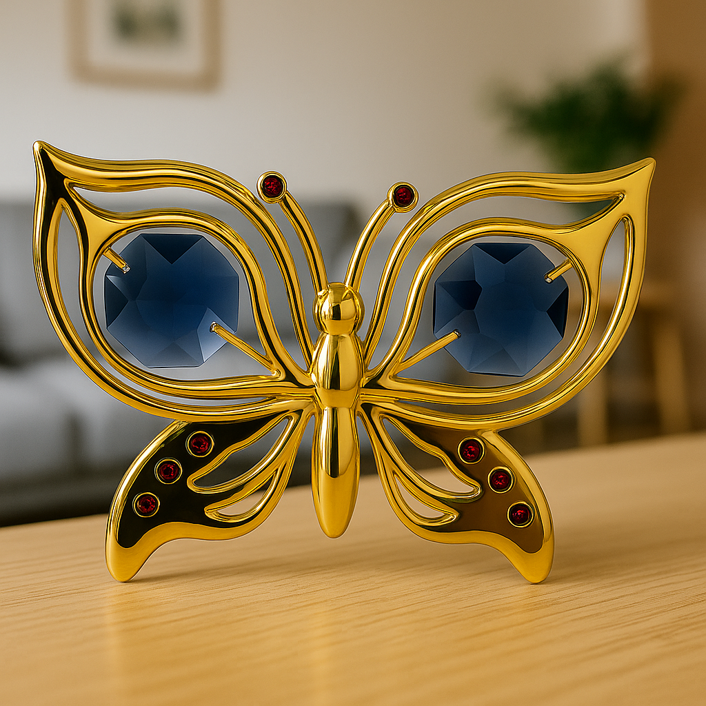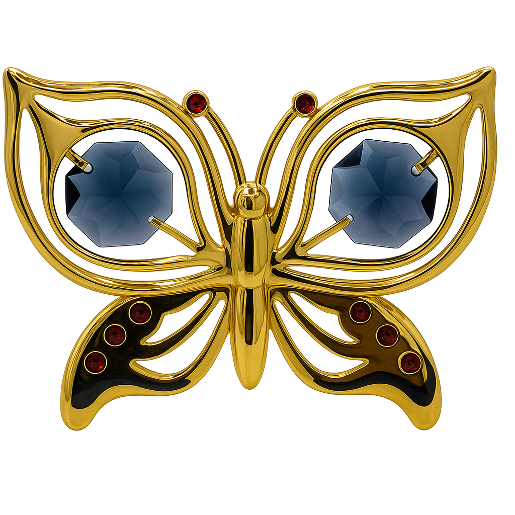 Laat je betoverend door elegante vlinder, verguld met 24-karaats deze goud en versierd met diepblauwe Bohemen-kristallen.
