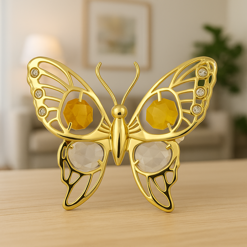 Een sierlijke vlinder, verguld met 24-karaats goud en rijkelijk versierd met prachtig geslepen Bohemia-kristallen. Dankzij de transparante zuignap bevestig je dit schitterende kunstwerkje moeiteloos op een raam, spiegel of glazen kastdeur.