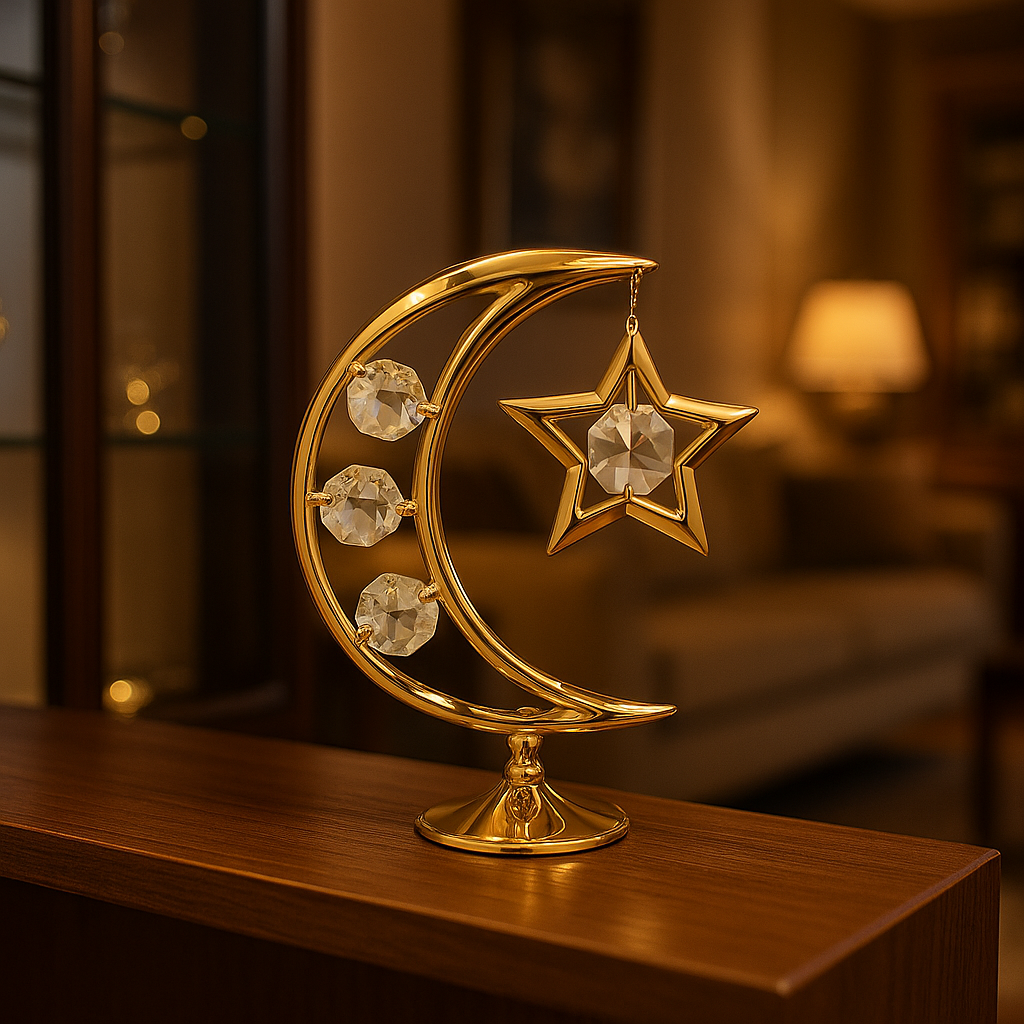 🌙 Maan & Ster Beeldje met Kristallen – 24K Verguld