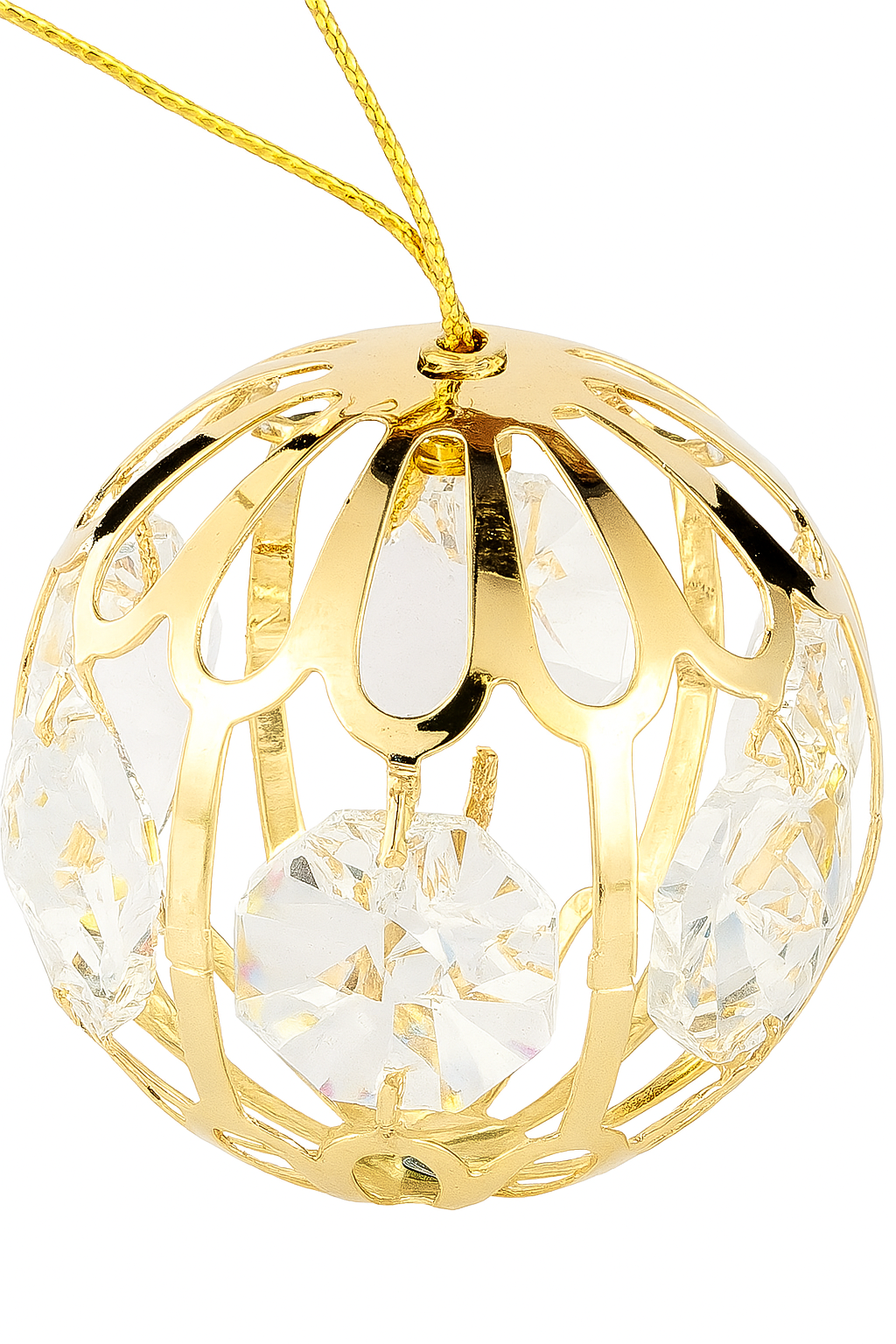 Voeg een praktisch luxe toe aan je interieur van een kerstboom met deze elegante 24-karaats vergulde ornamentbol. Het opengewerkte ontwerp omvat drie fonkelende Bohemen-kristallen die schitteren in het licht β ook zijn er kleine sterren in hangen.