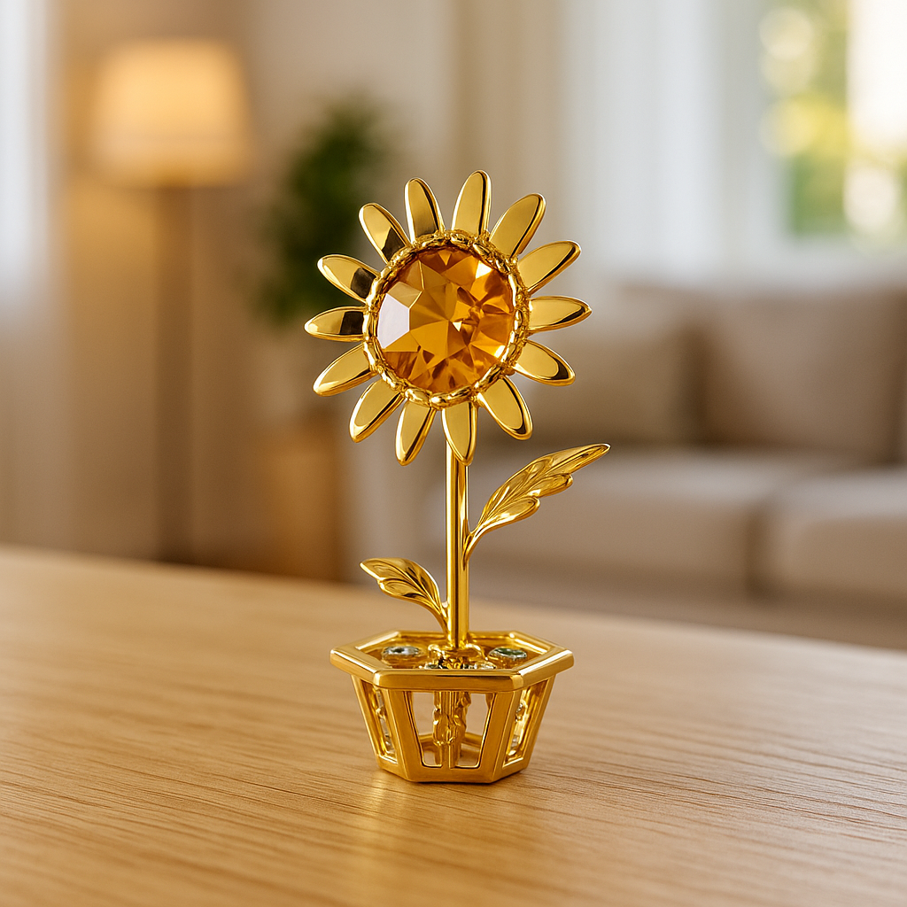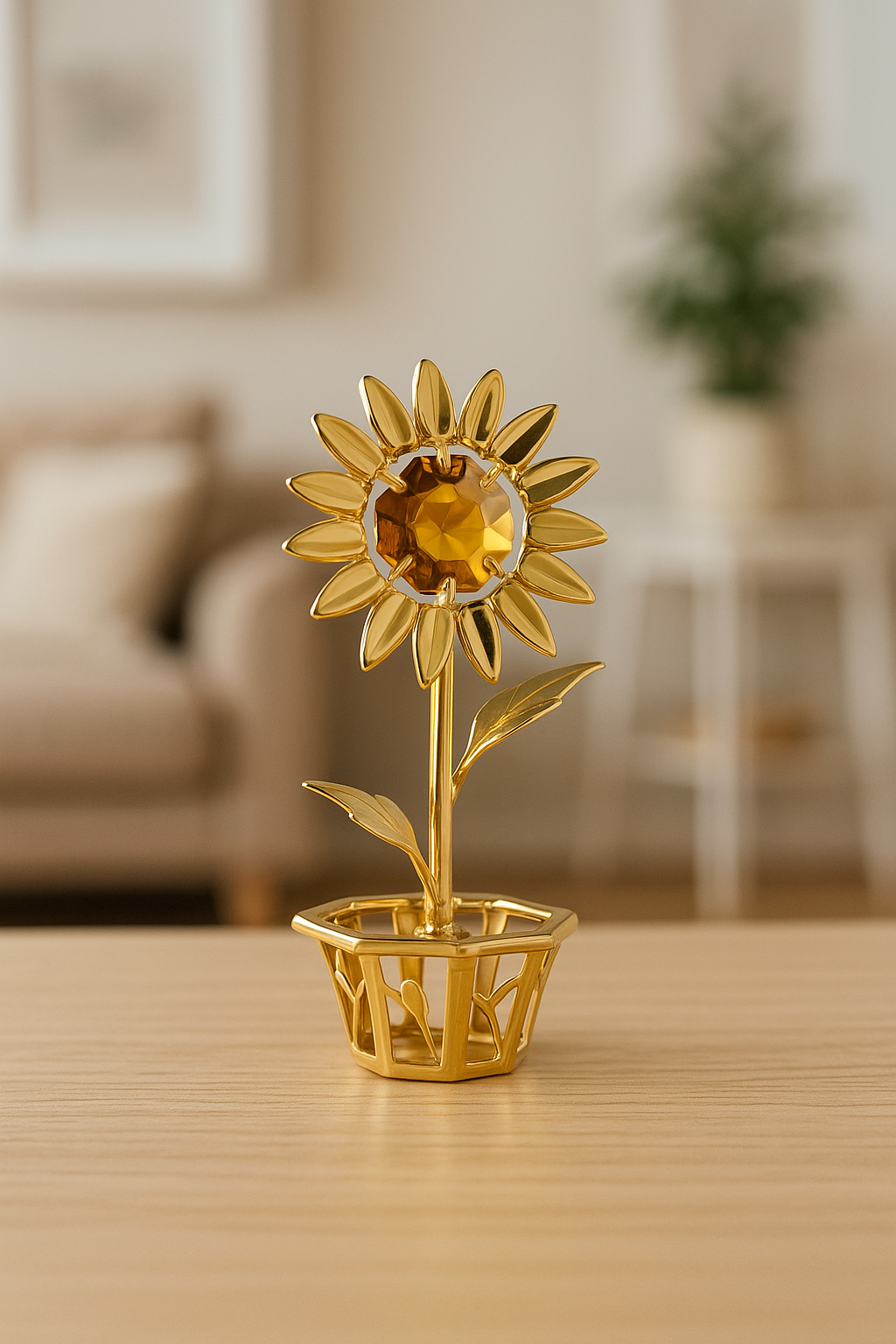 Laat je dag opfleuren met deze stralende zonnebloem! Deze charmante zonnebloem in potje is verguld met echt 24-karaats goud en schittert met een prachtige Bohemen-kristal in het hart van de bloem.